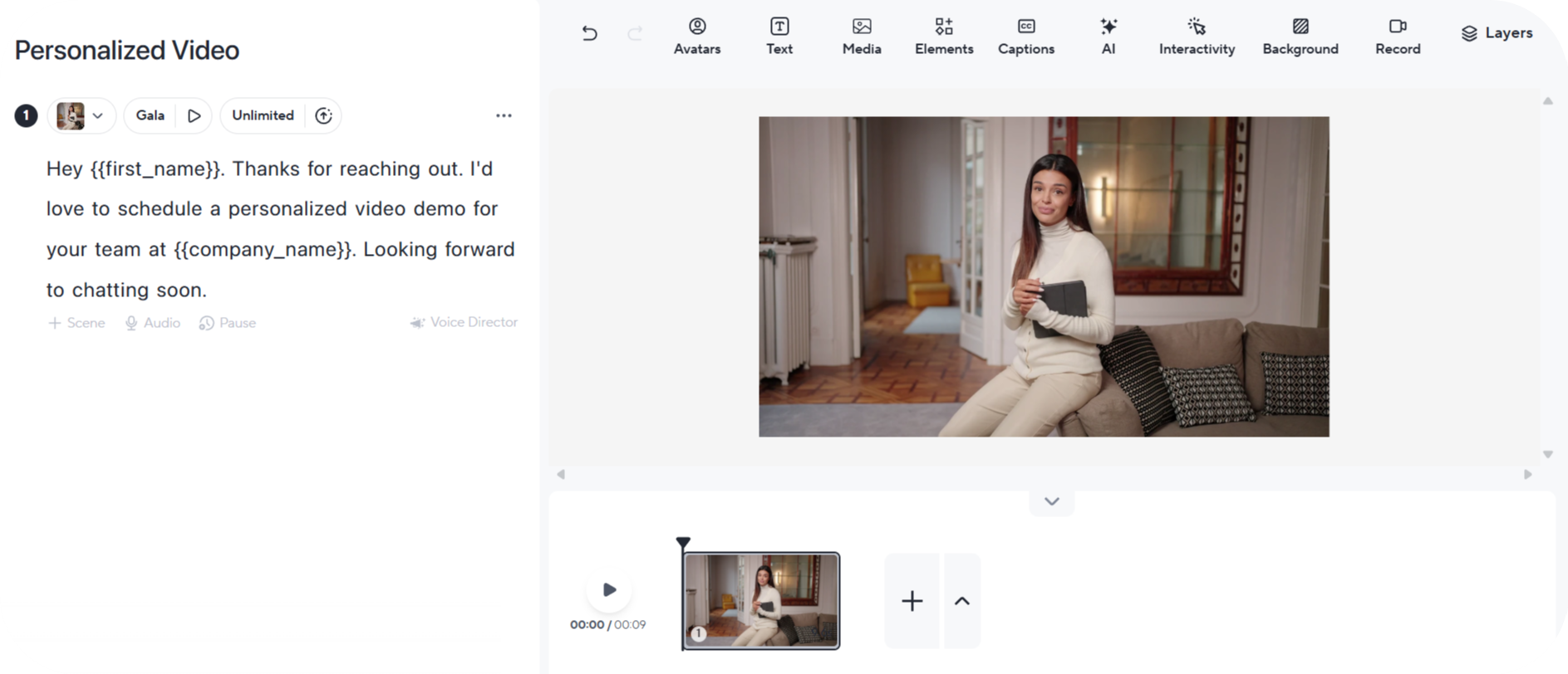 Personalized videos are created from regular templates that include dynamic variables - such as a viewer’s name, company, or product details - to tailor each video to its recipient. For step-by-step instructions on creating a template in the HeyGen interface, see Create a Template through Interface.