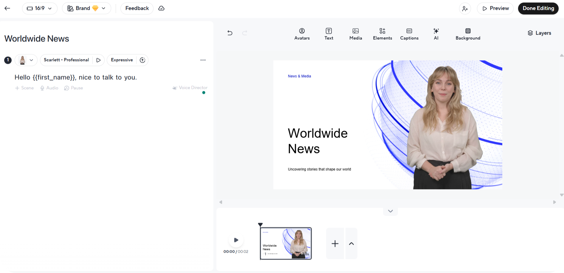 As shown, we've placed a {{first_name}} placeholder within our scene and script. In this tutorial, we'll set a value for this placeholder using the Template API and create a new video.